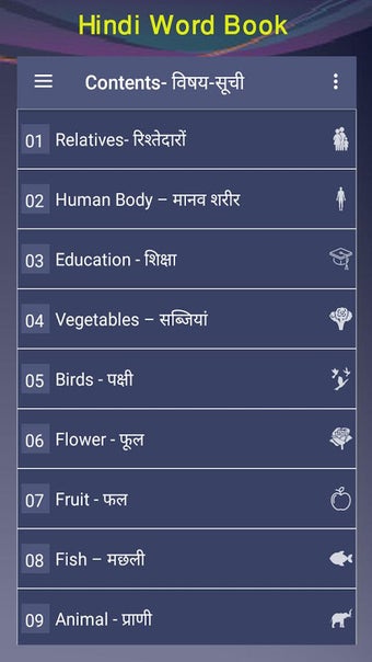 В этом приложении для изучения английского языка на хинди вы узнаете много типов слов из разных тем. Оно будет очень полезно для улучшения вашего словарного запаса на английском языке. Приложение содержит множество категорий слов, которые включают: животных, птиц, фруктов, овощей, частей нашего тела, предметов домашнего обихода, одежды и многих других. Слова произносятся на английском языке, и вы также можете их прослушать. В приложении есть опция словаря, которая поможет вам найти любое слово на английском языке. Вы можете тренировать свою произношение, слушая слова и тренируя произношение. Также есть различные аудио-опции, из которых вы можете выбрать. Опции звука, такие как mp3, wav, m4a, ogg и т. д., помогут вам улучшить свое слуховое восприятие и произношение на английском языке.